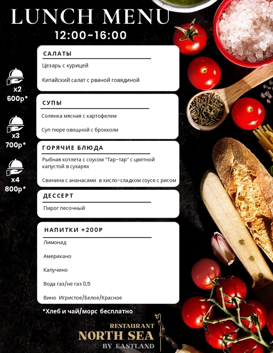 Теперь в будние дни с 12:00 до 16:00 мы предлагаем специальное бизнес-меню для деловых людей.